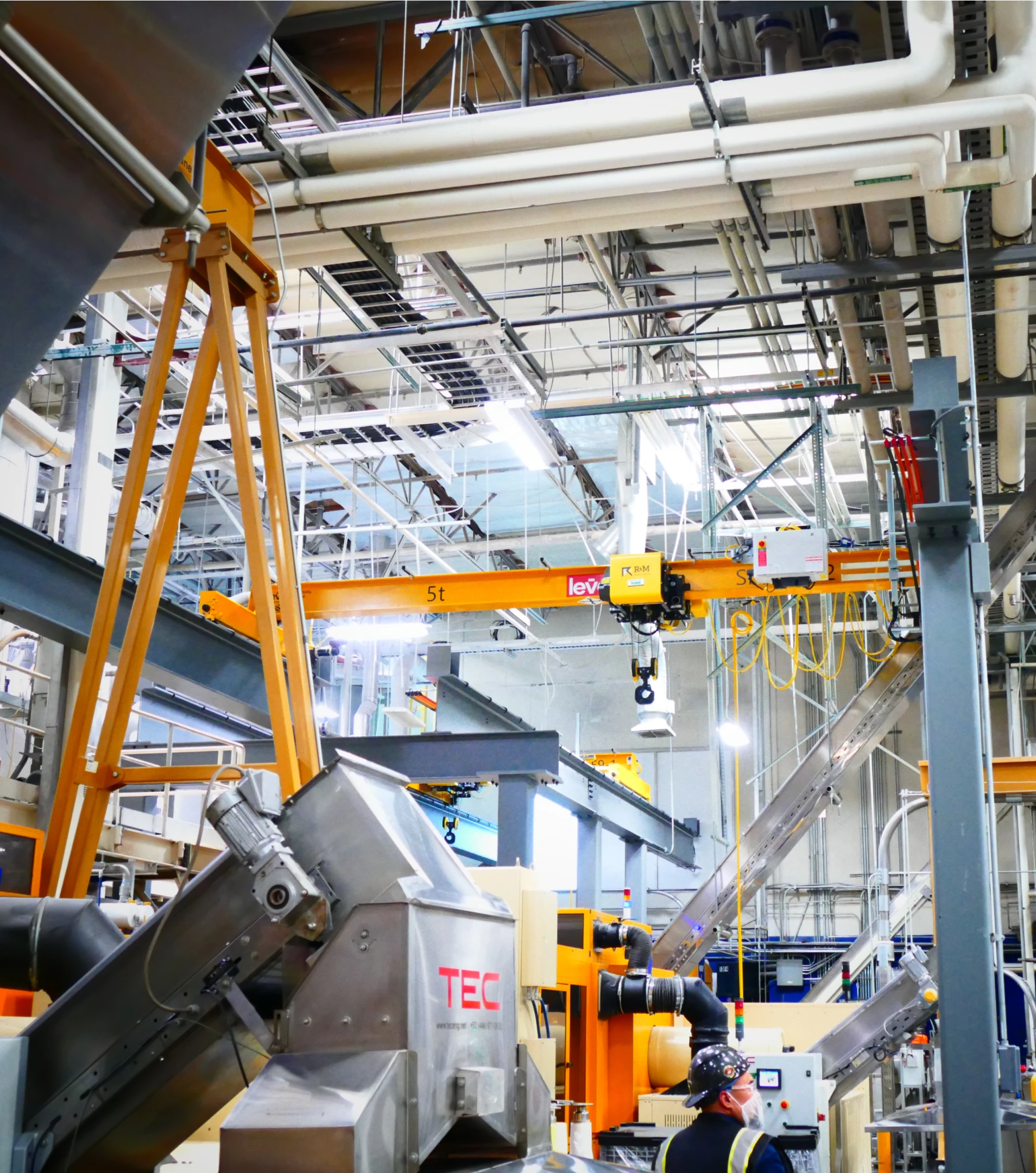 Heavy-duty bridge cranes designed for the demanding environment of paper and pulp manufacturing facilities.